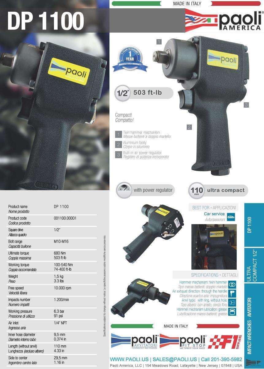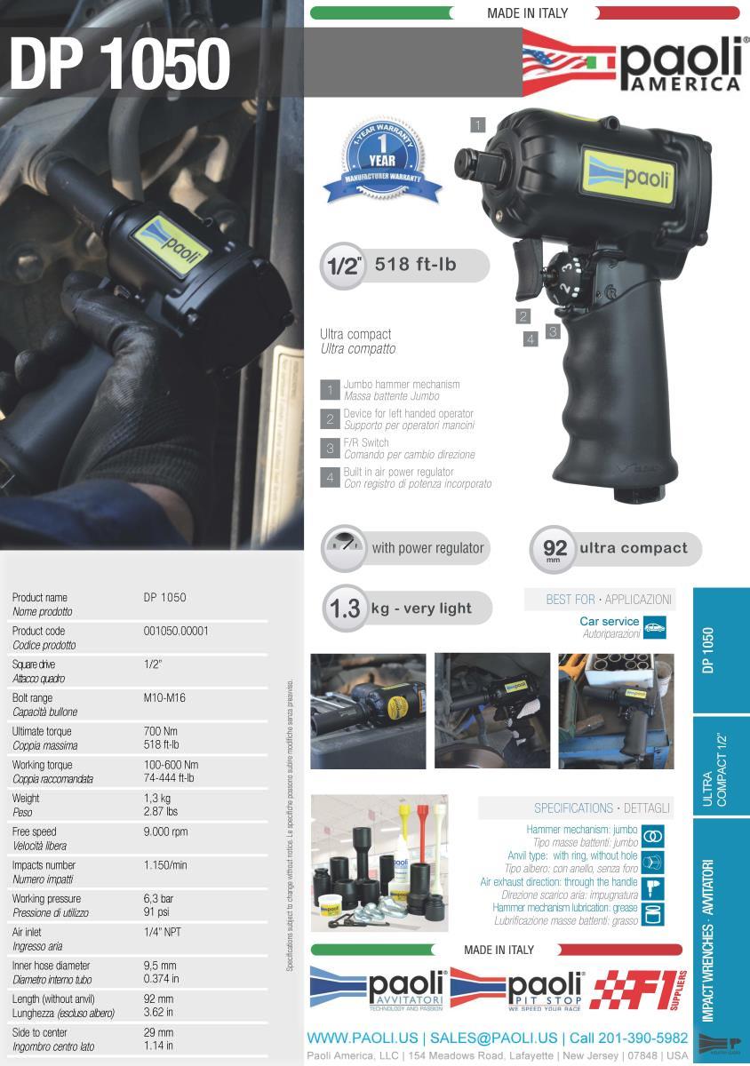 Dino Paoli offers 13 different models of racing wheel guns and 32 automotive and industrial models of impact wrenches. Many models are available with medium and long anvil sub-model. We also have many Nutrunners and ATEX certified Extreme edition impact wrenches. Our exclusive TSA (Torque & Angle Sensor System) TS Lab option is available on many racing and industrial models. When air is not an option or level of noise may be an issue, Dino Paoli offers very quiet and powerful electro-hydraulic systems.  In addition to impact wrenches, we offer a number of Ecological and Suspension system solutions. Our complete line of accessories offers everything you may need from superior quality Dino Paoli regulators to fittings.